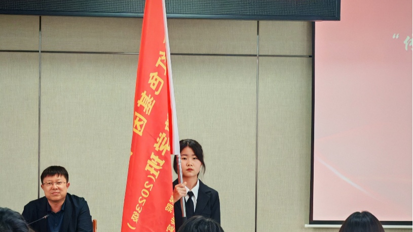 2023级本科生樊婷玉同学作为旗手接旗。旗帜猎猎招展,凝聚着勠力同心、携手并进的团结信念;吹响了志凌青云、步履铿锵的出征号角。