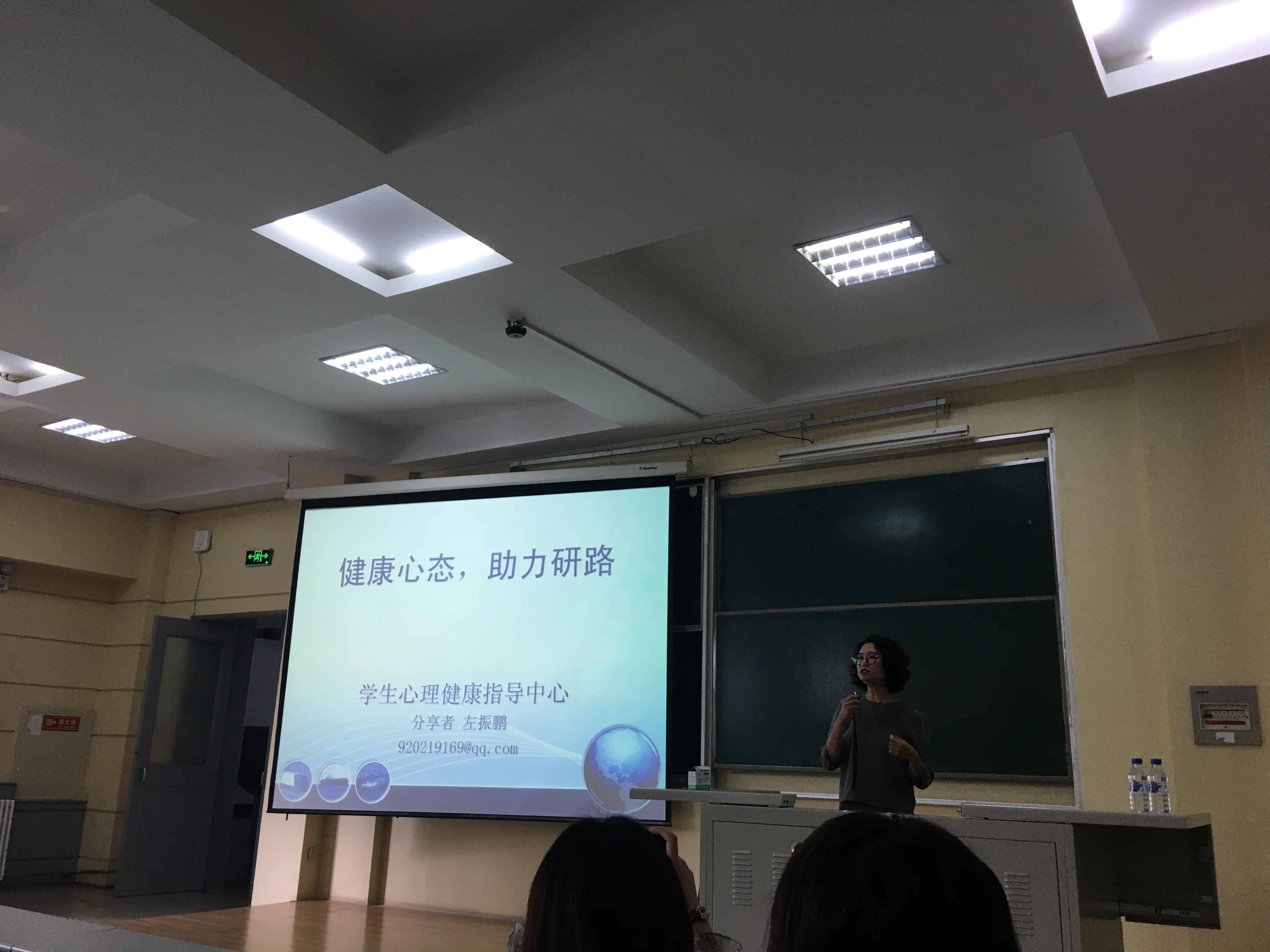 左老师首先对当前研究生的心理特点和易出现的心理问题进行了简要分析,并对影响研究生心理健康的因素进行了讲解。接着,左老师用生动风趣的语言为新生们着重讲述了入学后在环境适应、饮食习惯、学习研究、生活作息等方面的一些具体问题,并提出相应的促进心理健康的实际可行的建议对策,指出同学们要控制和转变认知观念,不断进行自我探索,正确对待并学会调节各种压力,学会管理自身情绪,保持阳光健康心态,积极乐观面对学业和生活。随后,左老师还与同学们进行了心理量表测试。同学们全神贯注于左老师精彩且实用的演讲,参与互动的情绪也十分高涨。最后,左老师告知学生们学校心理咨询室的具体位置,鼓励同学们充分利用学校资源及时进行心理疏导,心理咨询的老师们会尽最大努力帮助大家,陪伴大家健康愉悦度过研究生之旅。
