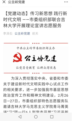 本次活动取得了圆满成功,宣讲团成员不仅利用专业优势传播了新思想、践行了新文明,更得到了一次宝贵的锻炼机会。作为寒假社会实践重点项目,团队得到了校团委和公主岭市委组织部的大力支持。公主岭市委组织部办公室主任孙海潮表示:“吉大学子们宣讲内容丰富,形式鲜活多样,不仅密切了学校和地方的交流,更展示了青年学子良好的精神风貌,期待未来能建立长效化的合作机制”。