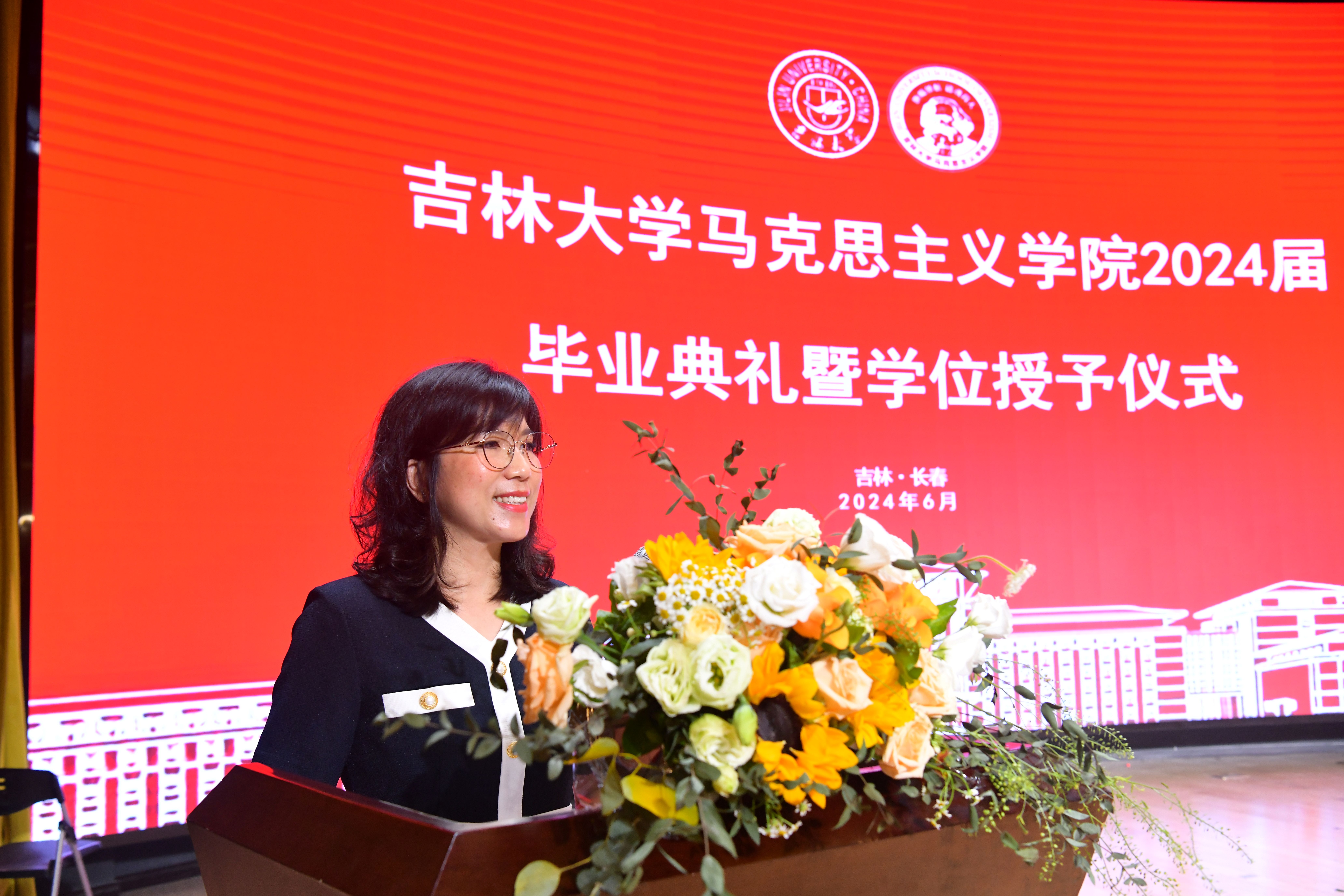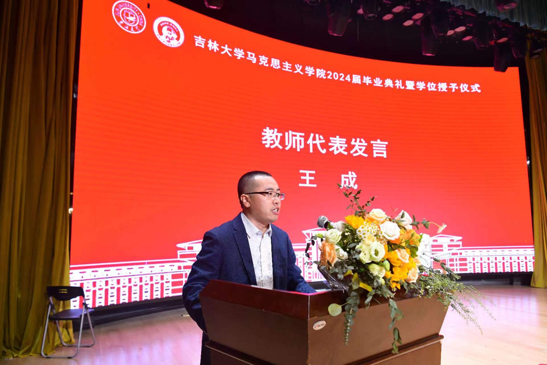 东北民族研究中心副主任王成教授作为教师代表向毕业生表达最真挚的祝愿。王成老师分享了从学生向教师转变的真切感受,与毕业生同学共勉:其一,学习和接受马克思主义理论的教育意味着认同,生活和生命中亦应肩负使命,王成老师勉励毕业生同学应树立理论自觉性、锚定方向,在为国家发展民族复兴的征程中贡献青春力量;其二,实践具有直接现实性,时代的变化和人生的问题不可逃避,勇于实践、勇于承担才能彰显生命的价值和人格尊严。最后,王成老师祝愿同学们心怀理想,大步前进,有情怀、能进取,继续在人生新的起点上大展宏图。