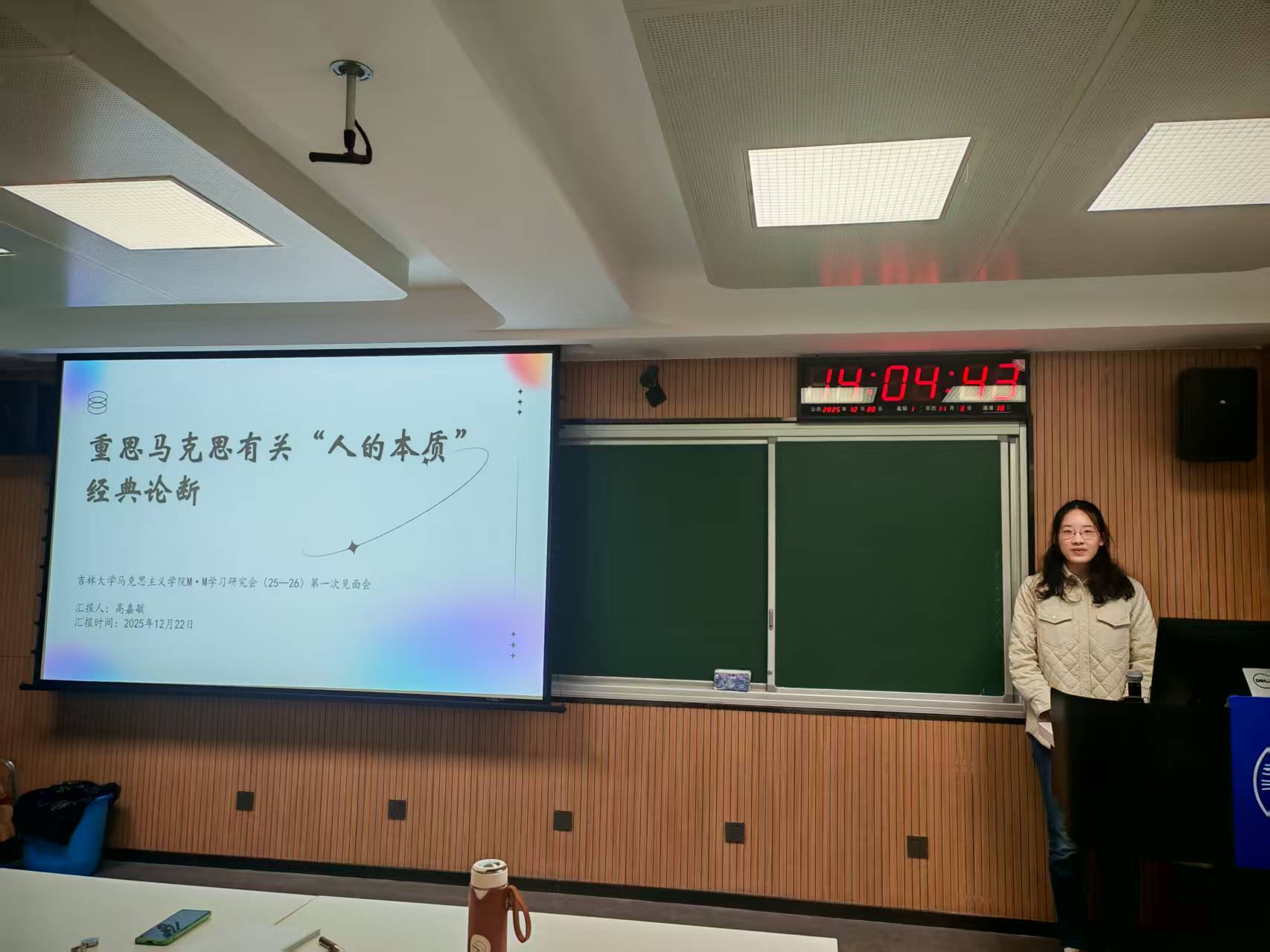 高嘉敏同学以“重思马克思有关‘人的本质’经典论断”为题展开分享。从人是人的最高本质、类本质、需要本质、共同体本质、社会关系总和本质五个维度,梳理马克思人学理论脉络,并结合经典原文与费尔巴哈理论对比分析,清晰阐释了理论的逻辑层次与现实内涵,也引发了在场同学对马克思主义人学理论的深入思考。