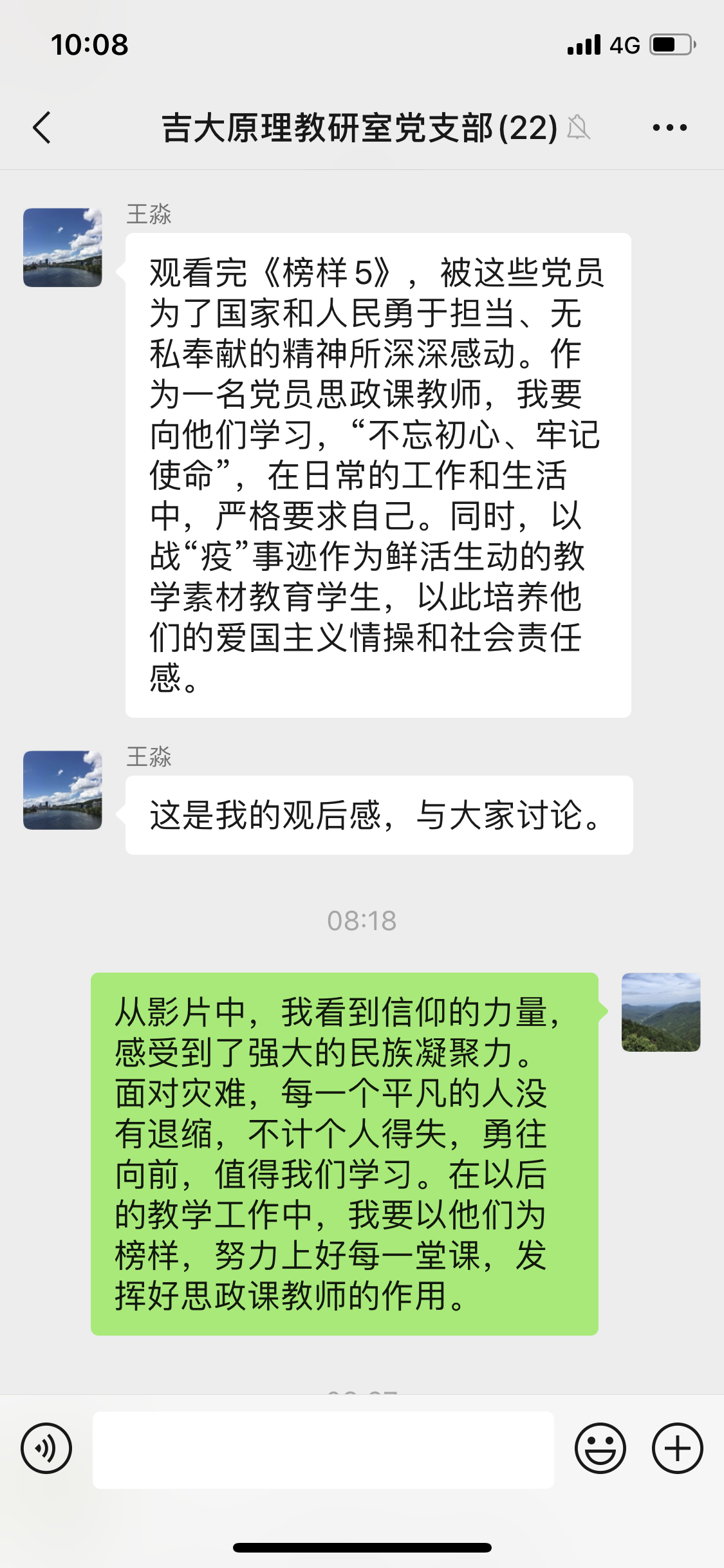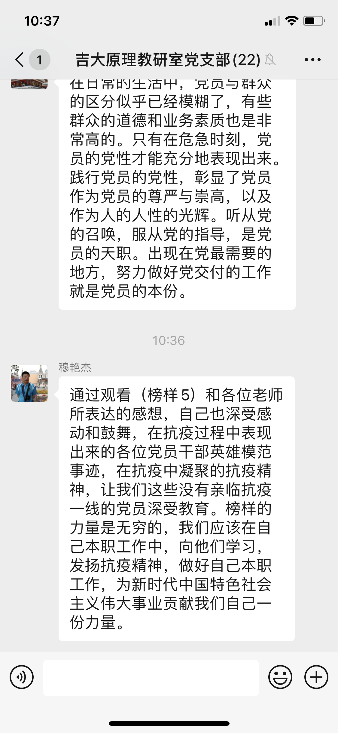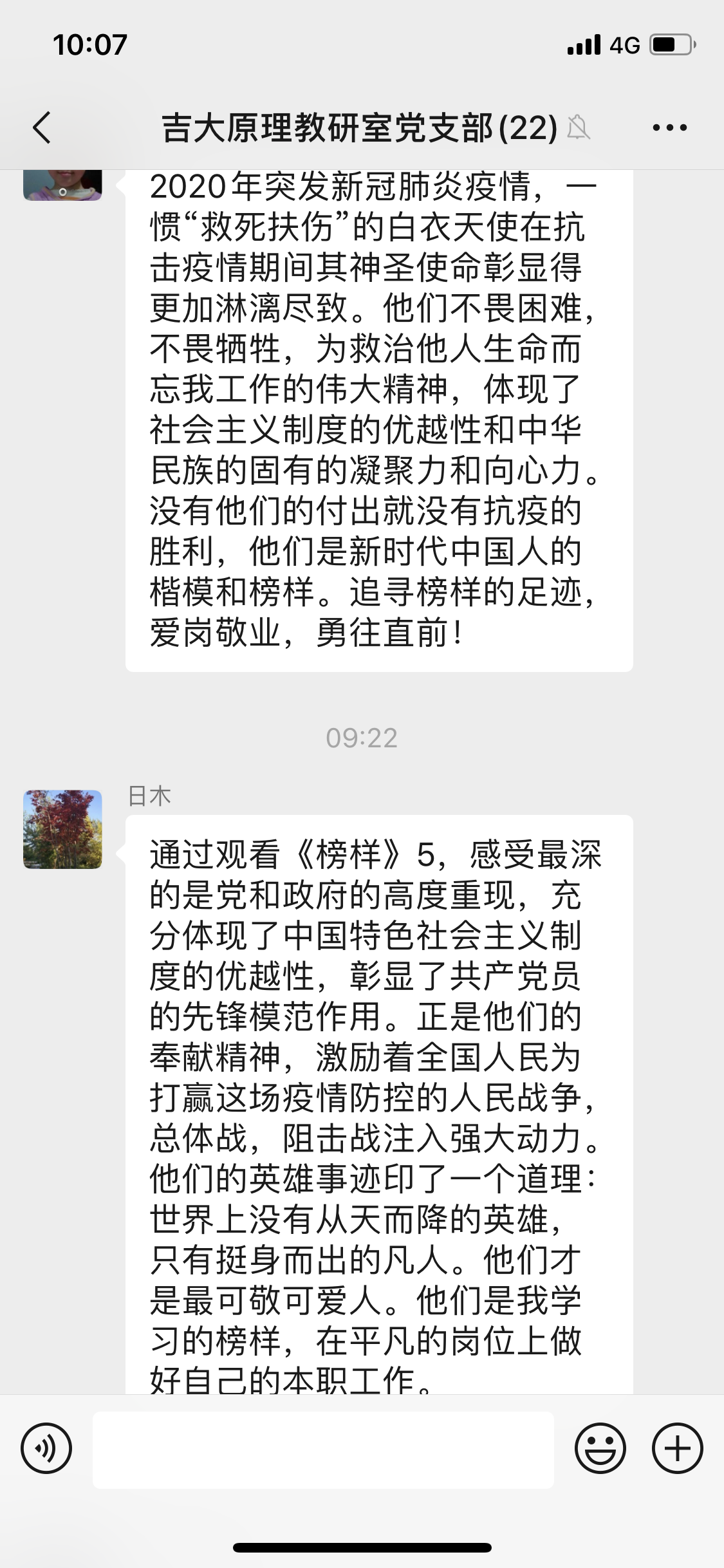 基本原理教工支部积极响应学校党委的号召,把学习榜样的力量与庆祝建党100周年活动紧密结合,于2021年3月29日晚10:00组织收看了《榜样5》专题节目,利用支部微信群举行线上研讨交流会。全体党员在观看节目之后纷纷发表了自己的观后感想。大家一致认为从影片中看到了信仰的力量,深深地感动于这些榜样为了国家和人民的利益勇于担当、无私奉献的精神,而且深刻地感受到信仰对于党员,就像灵魂之于个人。榜样的力量是无穷的,大家也都表示,作为思政课教师,要做好自己本职工作,为新时代中国特色社会主义伟大事业贡献自己的一份力量。