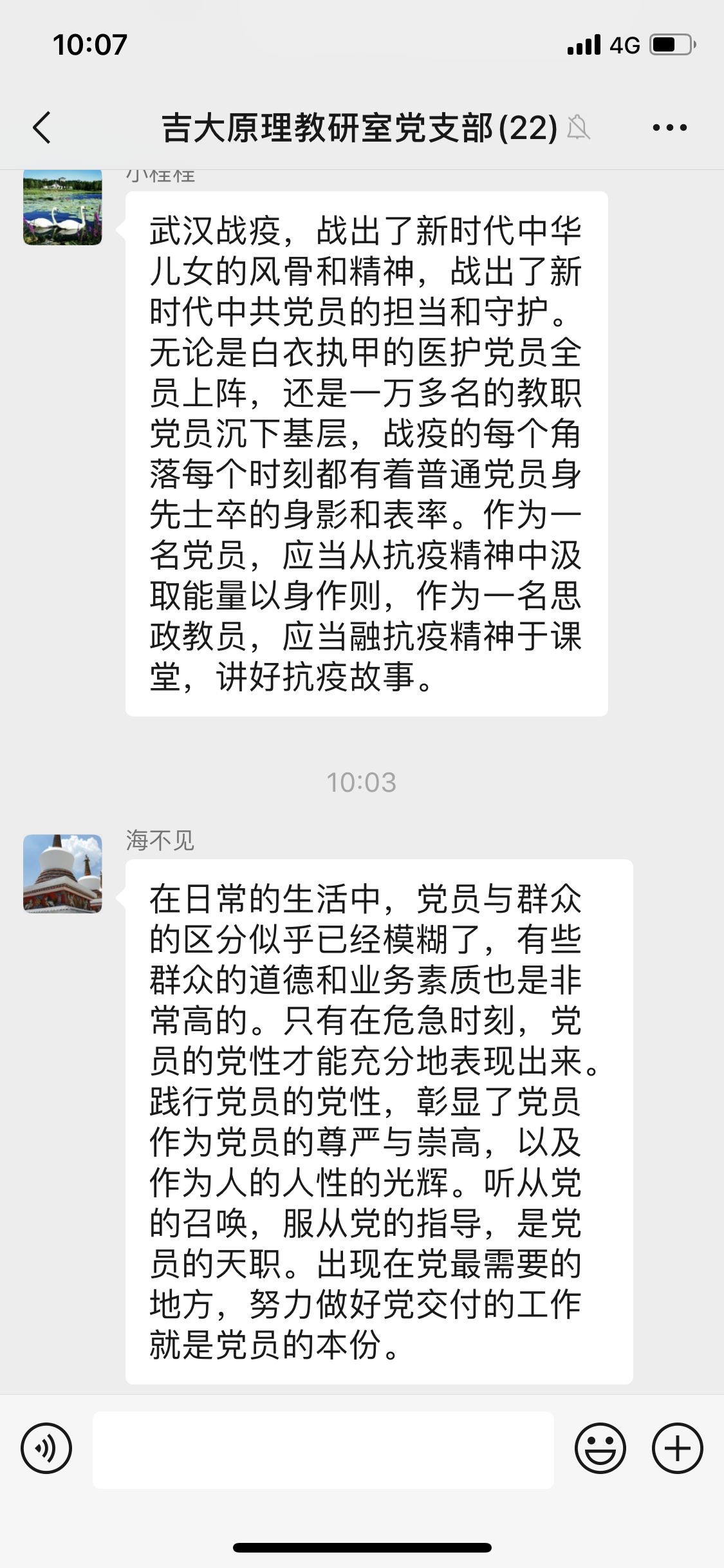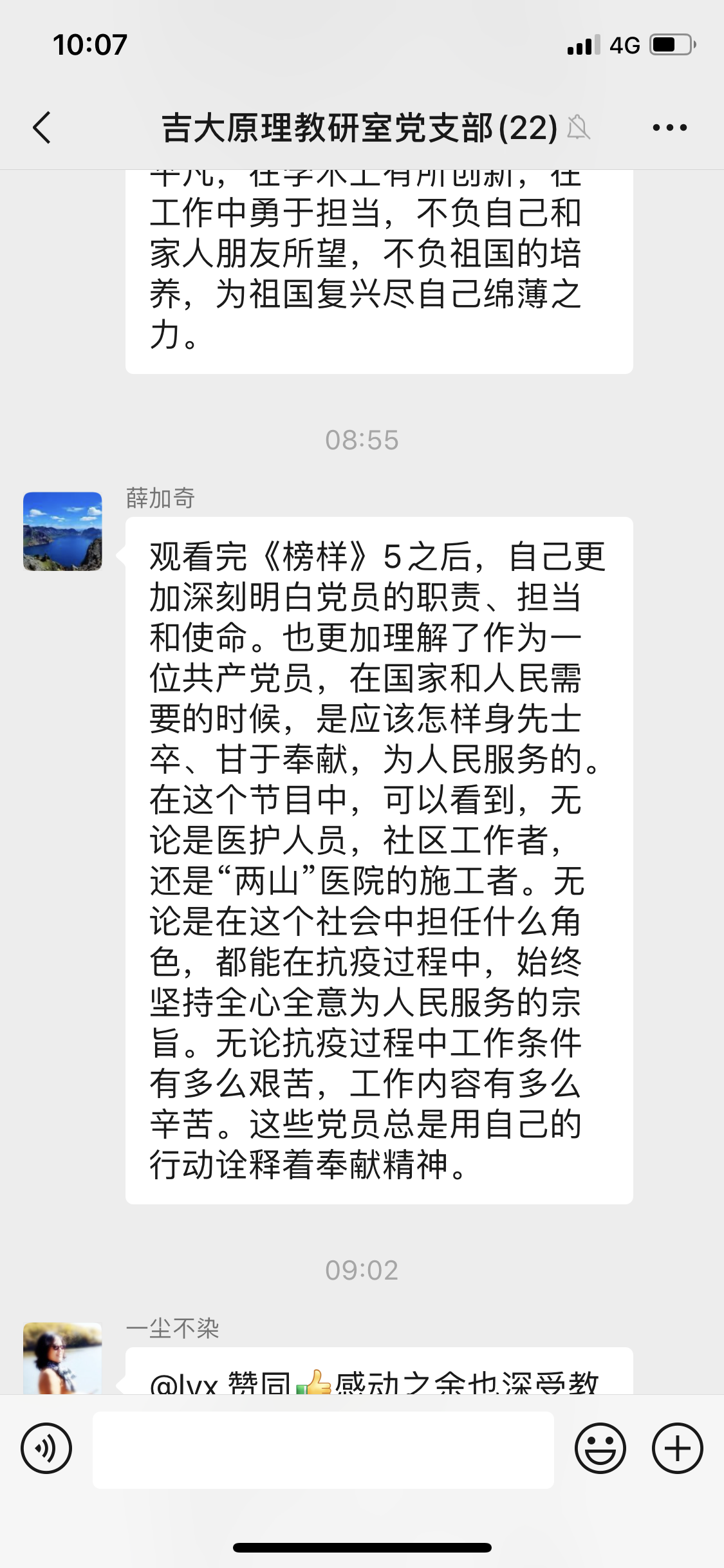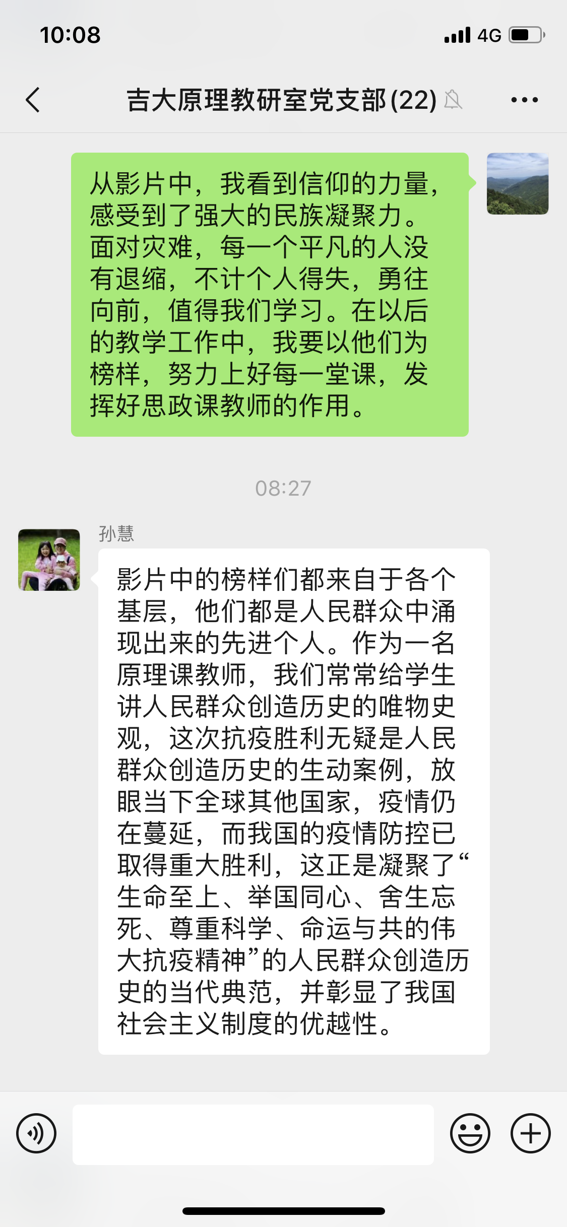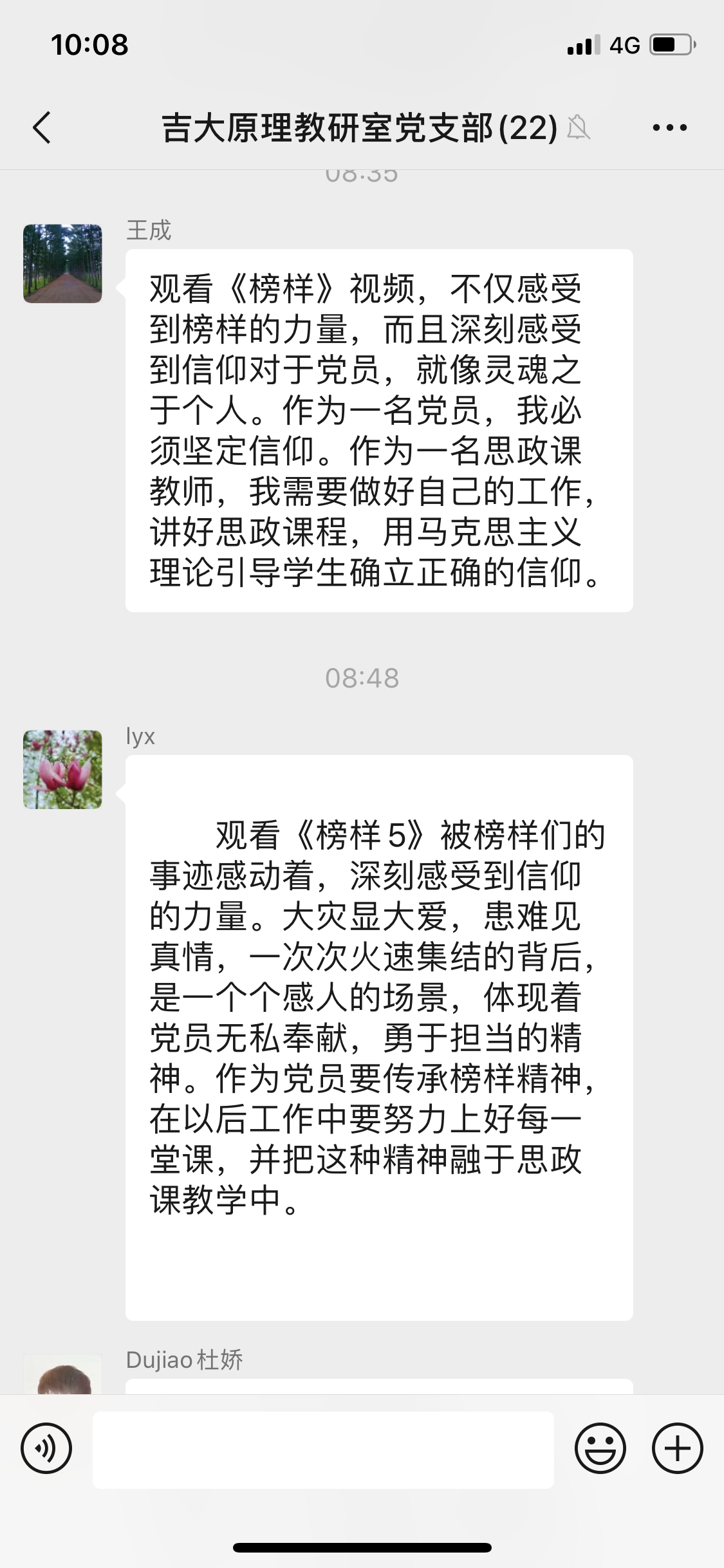 基本原理教工支部积极响应学校党委的号召,把学习榜样的力量与庆祝建党100周年活动紧密结合,于2021年3月29日晚10:00组织收看了《榜样5》专题节目,利用支部微信群举行线上研讨交流会。全体党员在观看节目之后纷纷发表了自己的观后感想。大家一致认为从影片中看到了信仰的力量,深深地感动于这些榜样为了国家和人民的利益勇于担当、无私奉献的精神,而且深刻地感受到信仰对于党员,就像灵魂之于个人。榜样的力量是无穷的,大家也都表示,作为思政课教师,要做好自己本职工作,为新时代中国特色社会主义伟大事业贡献自己的一份力量。