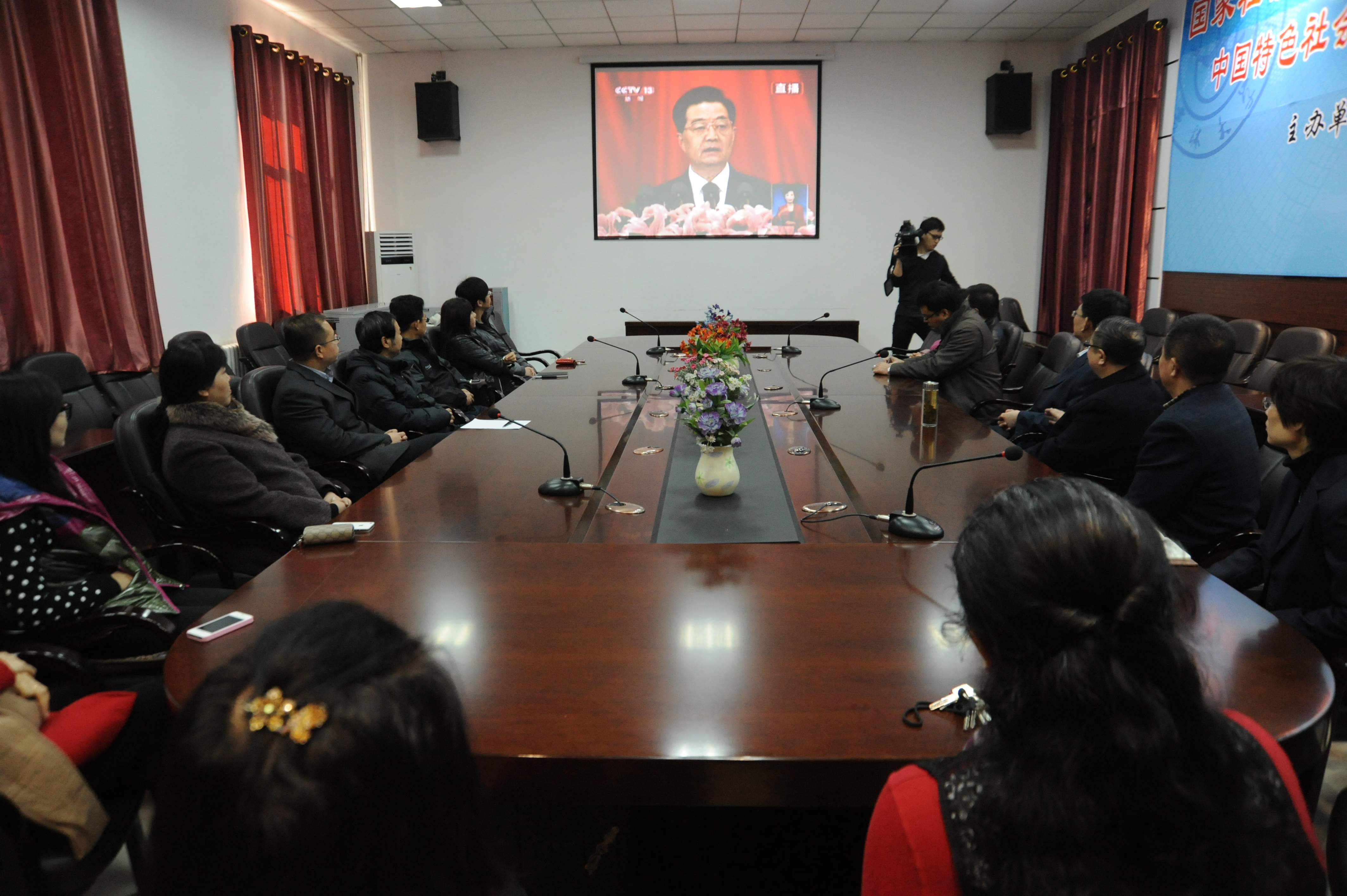 党委号召全院师生通过广播、电视、网络等不同形式收听、收看十八大开幕式盛况。上午9时,学院部分院领导、教师代表、党支部书记及全体行政人员围坐在多媒体会议室的大屏幕前,共同聆听了胡锦涛同志的报告。