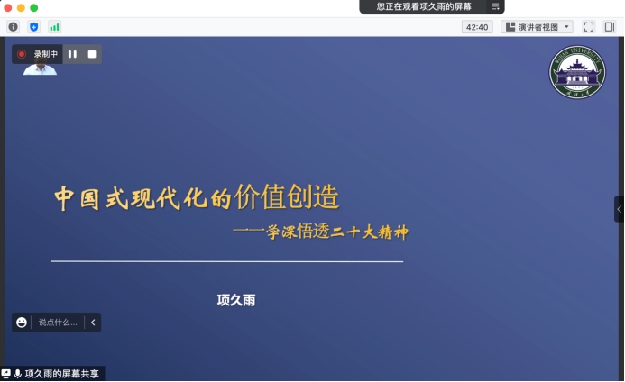 在两个小时的专题讲座中,项久雨教授围绕“中国式现代化”这一主题在二十大报告中的地位进行了深刻阐述,分别从中国式现代化是二十大的核心主题、全面理解中国式现代化的伟大创造、中国式现代化价值创造的未来展望三个层面聚焦主题,以微观逻辑对这一主题抽丝剥茧,展现了深刻的学术思考,提出了独到的学术观点,深化了对中国式现代化这一学术命题的学理认知。