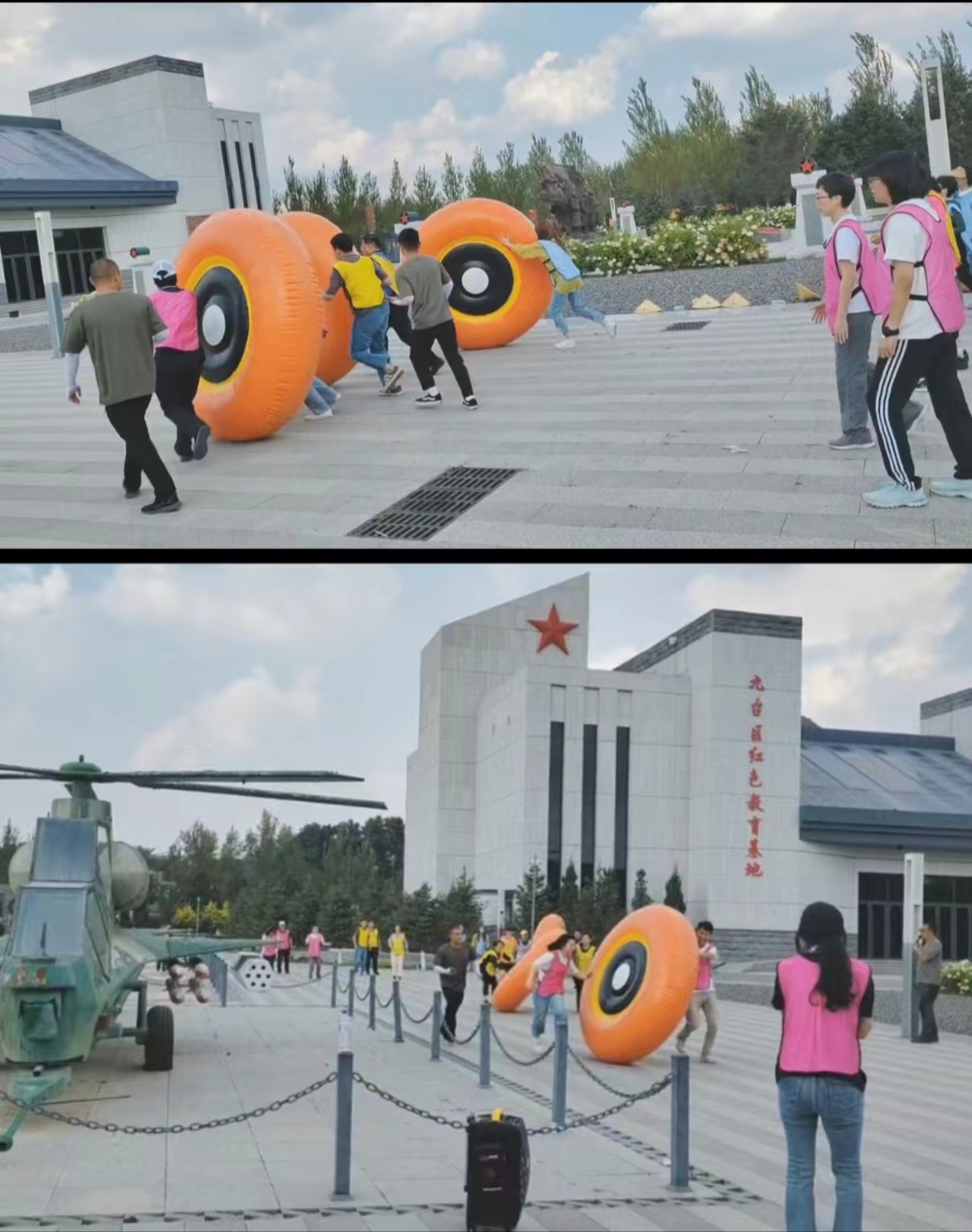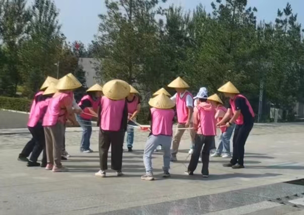 寻宝活动后是激情四射的拓展训练环节。参加团建的老师分成三组进行了拓展训练活动,每组由2名院领导、2名行政人员和10名教师组成,因身体原因不能参加拓展的老师加油助威。在“击鼓颠球、疯狂火箭、时代巨轮、草帽连连看”四项比赛中,老师们发挥自身优势,学习他人之长,互相配合,共同完成目标任务,真实地体现了一个团队的团结与协作,沟通与协调,真诚与信赖,激情与挑战的完美统一。大家在“击鼓颠球”中体验到全体成员缺一不可的整体性,互相包容、放平心态、不轻言放弃的精神;在“疯狂火箭”中感受到步调一致的重要性;“时代巨轮”中一人把控方向,一人掌握速度,密切配合才能形成合力的要领;“草帽连连看”活动中要听从指挥,互相协作才能达到“众志成城”。