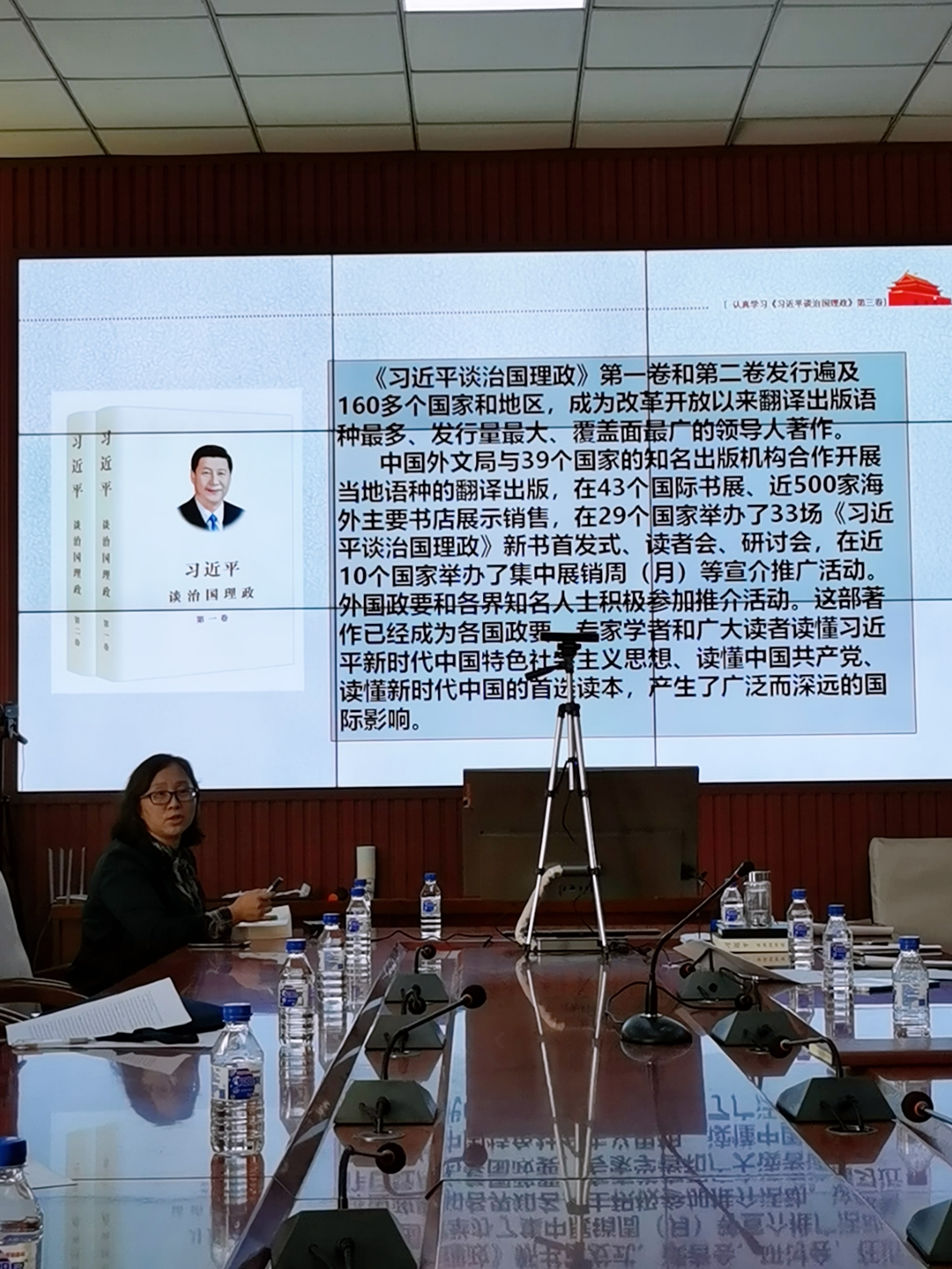 学院副院长石瑛以《坚持人民至上 牢记初心使命》为题,分别从《习近平谈治国理政》第三卷出版概况、为什么学、学什么和怎样学四个方面对《习近平谈治国理政》第三卷进行了导读。她简要介绍了《习近平谈治国理政》第一卷、第二卷和第三卷的概况和彼此间的整体系统联系,指出习近平新时代中国特色社会主义思想是立足中国、引领时代的当代中国马克思主义、21世纪马克思主义,是进行“两个革命”、创造“两个奇迹”的行动指南,是为携手构建人类命运共同体贡献的中国智慧、中国方案。重点讲解了19个专题的内在逻辑和聚焦的根本问题,最后,她建议大家要在多思多想、学深悟透上下功夫,在系统全面、融会贯通上下功夫,在知行合一、学以致用上下功夫,深刻理解其核心要义、精神实质、丰富内涵、实践要求。